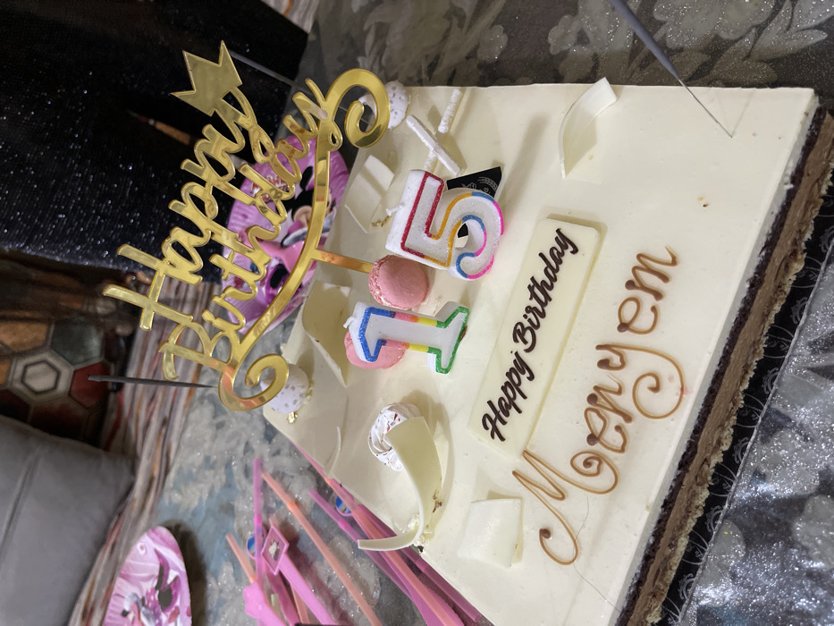 - "This image captures a rectangular birthday cake situated on a patterned fabric surface, indicative of an indoor celebration in Meknes, Morocco" by FM-uEYoy1, licensed under CC BY 4.0