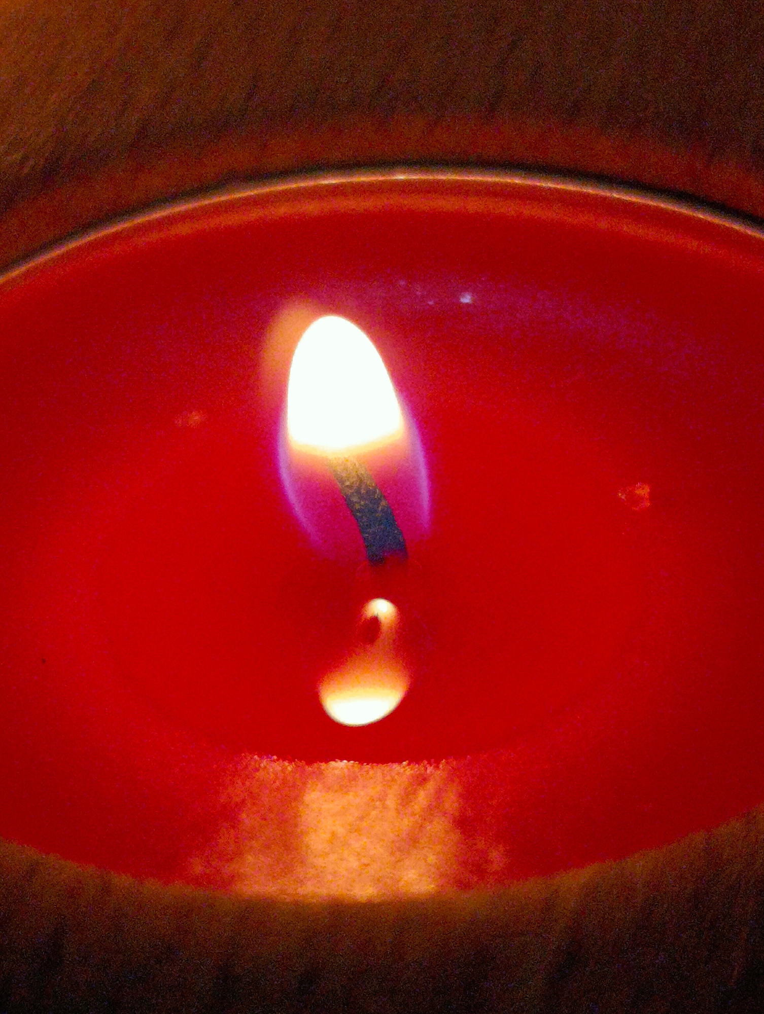 close-up, top-down view of a lit candle. The candle appears to be contained within a circular vessel, likely made of a dark-colored material. The wax is bright red, reflecting the light from the flame. The flame itself is a bright white-yellow with a darker wick visible in the center. Below the main flame, a smaller, reflected flame can be seen on the surface of the melted wax. The image is slightly out of focus, creating a soft, diffused appearance. The bottom edge of the image is blurred, revealing what looks like the top of the container, which appears dark brown. No people, objects, actions, interactions or environment that relate to Shiroko pole, Bulgaria are visible in this image.