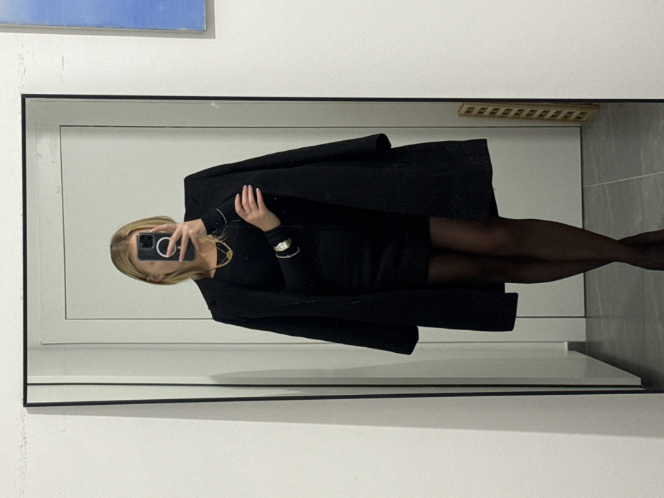 A blonde woman is reflected in a mirror, taking a selfie. She's wearing a black dress, black tights, and a black coat draped over her shoulders. She has a gold necklace and several bracelets on one wrist. The mirror's frame is black, and a light fixture is visible above the reflection. Part of a blue-framed artwork is seen in the top left corner outside the mirror's reflection.