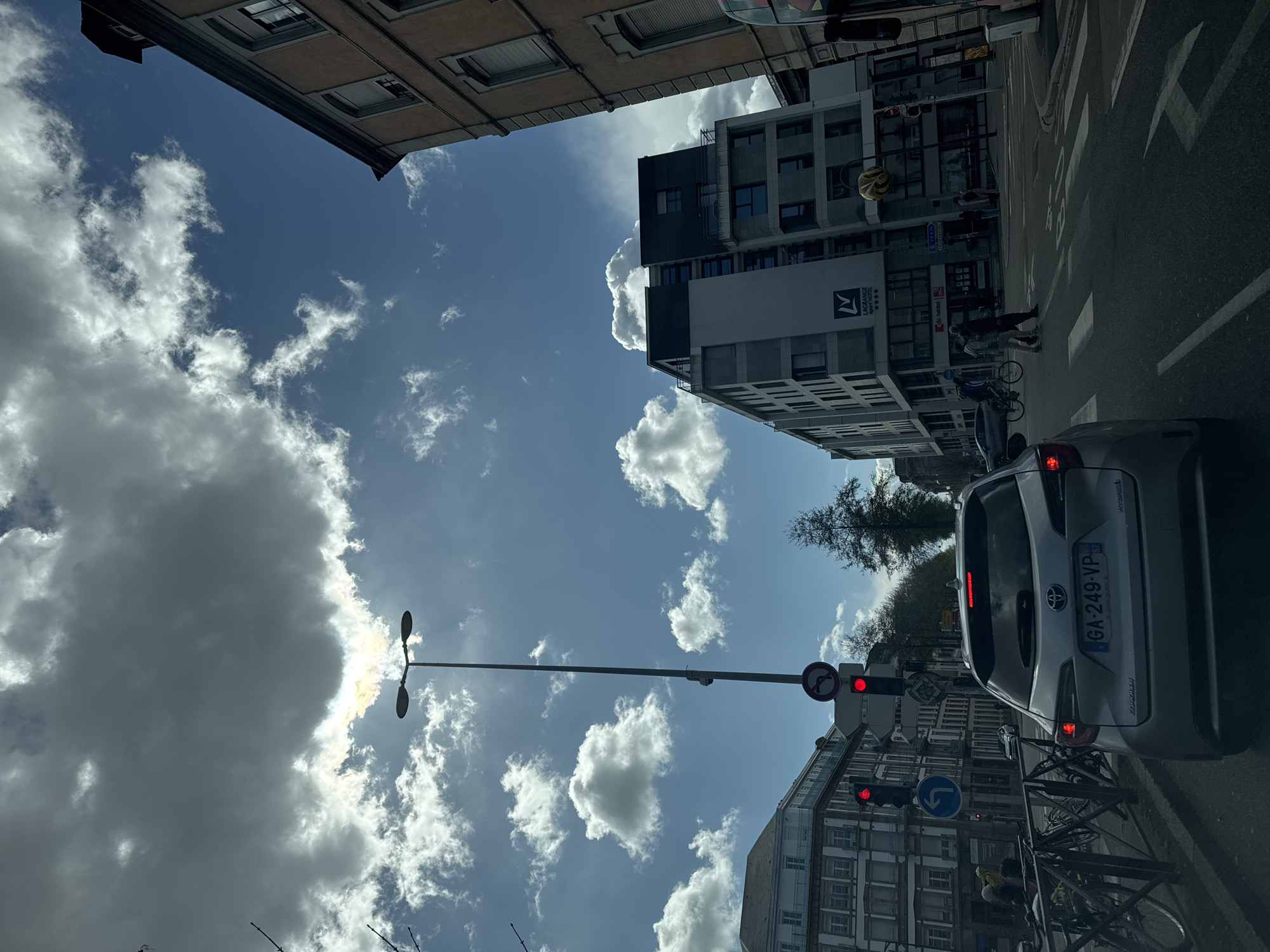 The image depicts a daytime urban street scene at an intersection in Strasbourg, France, specifically at the corner of Boulevard du Président-Wilson and Rue du Marais Vert, looking towards the east/southeast. The sky is partly cloudy with patches of bright blue and scattered cumulus clouds, some illuminated by direct sunlight. In the immediate foreground, the rear of a silver Toyota Corolla (license plate GA-249-VP, registered in France) is visible, its brake lights illuminated, indicating it is stopped. The vehicle bears "HYBRID" badging on the right. Road markings, including a white arrow for a right turn, are visible on the asphalt. To the left of the Toyota, a metal fence lines the sidewalk, with several bicycles parked alongside it. Beyond the fence, an older, multi-story building with a light-colored facade and balconies is visible. A tall streetlamp with two luminaires stands centrally, accompanied by two red traffic signals (one for vehicles, one for pedestrians) and a blue circular sign indicating a left turn. To the right of the Toyota, across the intersection, a modern multi-story building with a grey and white facade is prominent. This building features the signage "LAGRANGE appart' HOTEL ****" and "Ciclo habitat." At its base, a marked pedestrian crosswalk is visible. Several pedestrians are either crossing the street or waiting on the sidewalk near this building. A person on a bicycle is also present in the street, near the crosswalk. On the far right, partially obscured, is an older building with a yellowish-brown facade and windows with external blinds. A segment of a red and blue bus is visible in the lower right corner, indicating public transportation. Trees with sparse foliage are visible in the background, primarily on the left and center.