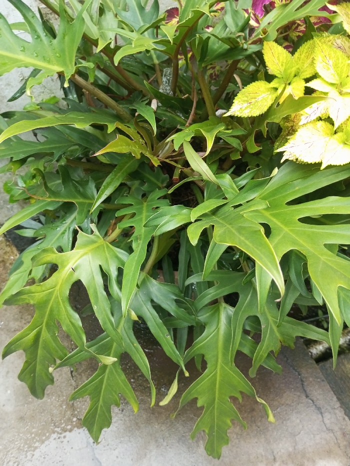 The scene depicts a dense arrangement of plants situated in the city of Pandaria, India. In the foreground and midground, a prominent plant displays numerous large, deeply lobed, dark to vibrant green leaves, characteristic of a *Philodendron* species, some showing water droplets on their surfaces. Visible among these are reddish-brown stems. To the upper right, a distinct plant cluster features smaller, variegated leaves primarily in shades of light green and yellow, with hints of purple or dark red on some leaves, consistent with a *Coleus* variety. The lower portion of the image reveals a grey concrete surface, visibly damp with scattered moisture. No people or human activity are observed within the frame.