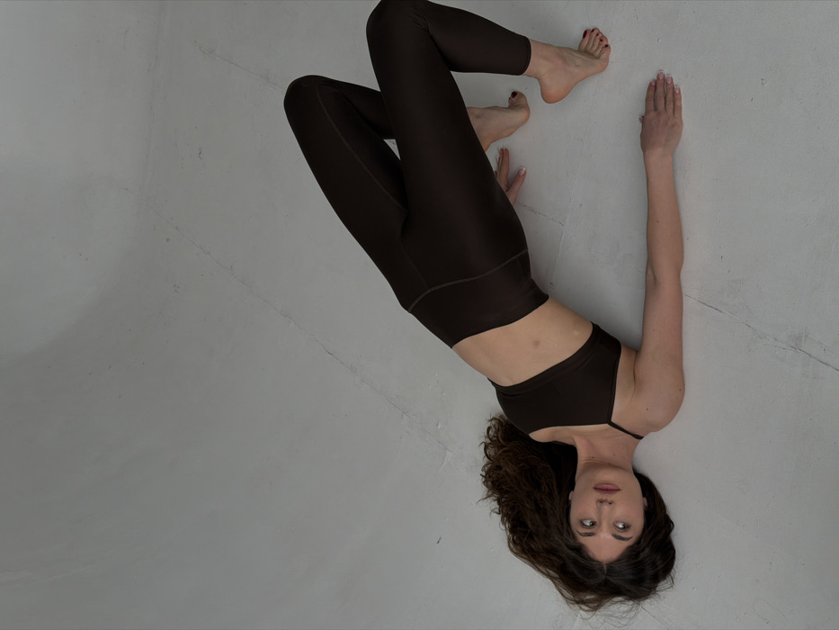 The image depicts an indoor scene within a studio environment. The backdrop consists of a light grey, seamless cyclorama-style floor and wall, displaying minor surface wear and faint linear marks on the floor. A female individual with long, dark, curly hair is positioned on her back, performing a "bridge" pose. Her head rests on the floor, facing the camera directly. Her knees are bent, feet flat on the ground, and her torso and hips are elevated. Her arms are extended alongside her body, palms flat on the floor. She wears a dark brown two-piece athletic set, comprising a sports bra with thin shoulder straps and matching high-waisted leggings. Both her fingernails and toenails are painted red. A hypopigmented mark is visible on her right lateral torso. The lighting is uniform and diffused. No discernible landmarks or external features are present within the image to identify the city of Yerevan, Armenia, or any specific geographical location.