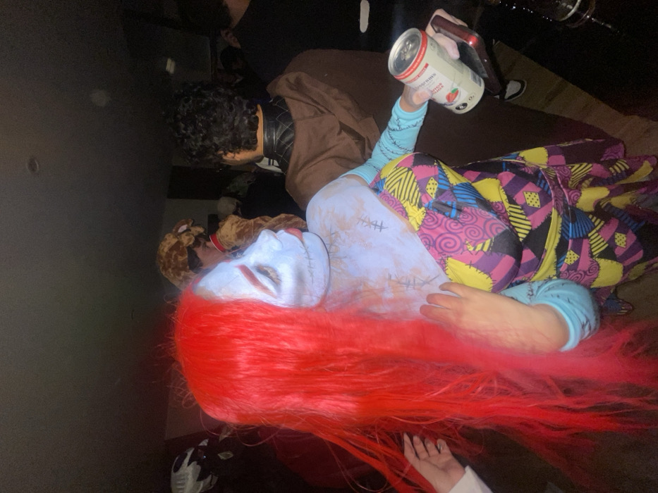 The image depicts an indoor social gathering in Zibatá, Mexico, under dim artificial lighting. The central figure is an individual costumed as the character Sally from *The Nightmare Before Christmas*. This person wears a long, bright red wig and has light blue body paint on the face, neck, chest, and arms, accentuated with drawn black stitch marks. The attire consists of a patchwork dress featuring a variety of geometric patterns in pink, yellow, blue, and black. The subject holds a white aluminum beverage can, marked with red and green graphics indicating "strawberry" flavor, in their left hand. A partially visible hand is positioned near the central figure's right arm/shoulder area. In the background, behind the primary subject, another individual is observed from the rear, exhibiting dark, curly hair and wearing a brown hooded garment with a distinct patterned collar. Further into the background, a person in a brown, animal-themed costume with a red collar is partially visible. The scene suggests a crowded environment, with additional indistinct figures visible throughout the background and a dark, reflective surface, possibly a bar or table, present in the foreground to the right.