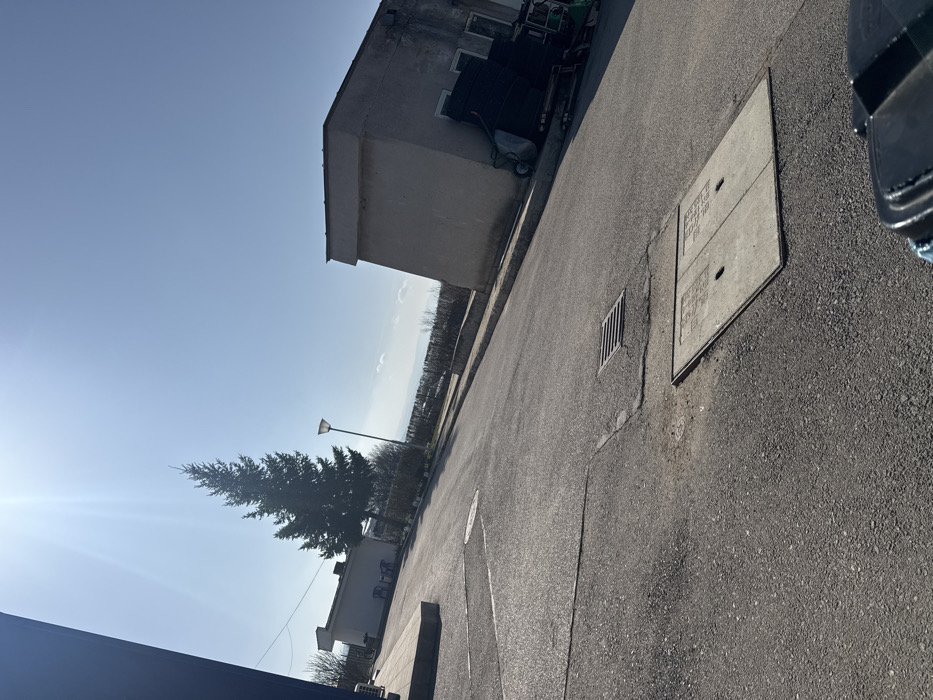 The image depicts an outdoor scene in Gorna Malina, Bulgaria, under bright daylight with a clear sky. The ground consists of an asphalt surface, showing minor cracks and wear. In the mid-foreground, two rectangular utility covers are embedded in the asphalt: a metal grate drain and a larger concrete cover with two circular access points. A partial view of a dark, textured object, likely a waste bin lid, is present in the bottom right corner. An asphalt road, sloping gently upwards, dominates the central area. To the left, a light-colored building with a flat roof is partially visible, with three white plastic chairs positioned outside. A tall, dark green coniferous tree stands centrally in the midground, with a single street light pole positioned slightly to its right. To the right of the road, a light-colored, weathered building with a flat roof features multiple dark, rectangular objects stacked against its side and a small, green utility vehicle or machinery partially visible nearby. The background reveals a distant, hazy landscape with an unclear horizon line beneath a bright, blue sky. Intense sunlight from the upper left creates strong illumination and a lens flare in that quadrant. No individuals or discernible activity are present in the scene.
