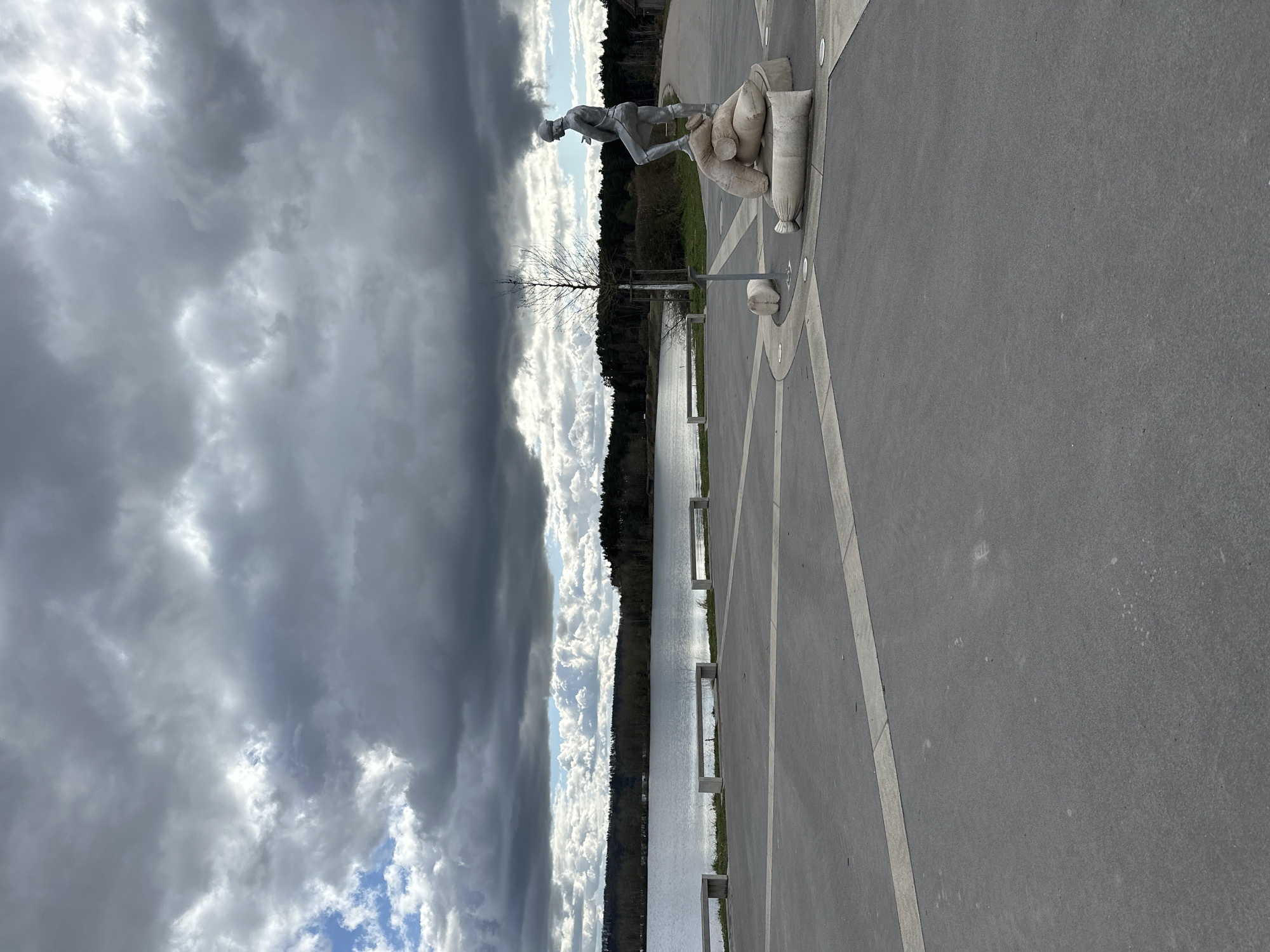 The image captures a view of the Spalt, Germany lakeshore promenade. In the foreground, a statue of a man working with sacks is prominently displayed. Behind the statue, the lake extends into the background, flanked by a dense line of trees on the opposite shore. The sky is overcast with dark, heavy clouds, with patches of blue sky peeking through. The surface of the promenade is gray and features geometric patterns. There are benches along the promenade.