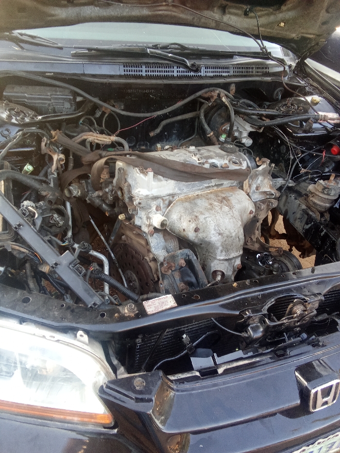 engine bay of a black Honda vehicle. The engine itself is prominently displayed, appearing somewhat weathered. Various components are visible around the engine, including wires, hoses, and the cooling system. The front of the car, including a headlight and the Honda emblem, is also visible. The engine bay appears to be in a state of disassembly or repair.