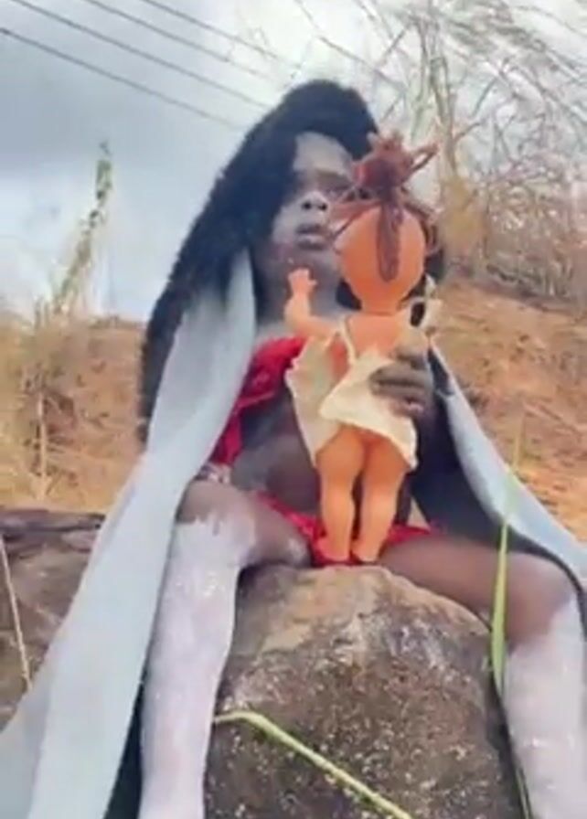 A person with a dark complexion and face paint, wearing a red top and bottom, a black hair covering, and a light grey shawl, is holding a doll. The person is sitting on a rock in an outdoor, hilly environment. They are wearing white shoes and white leg coverings. The background includes dry grass, some green plants, and overhead power lines. The person appears to be looking around while holding the doll close.