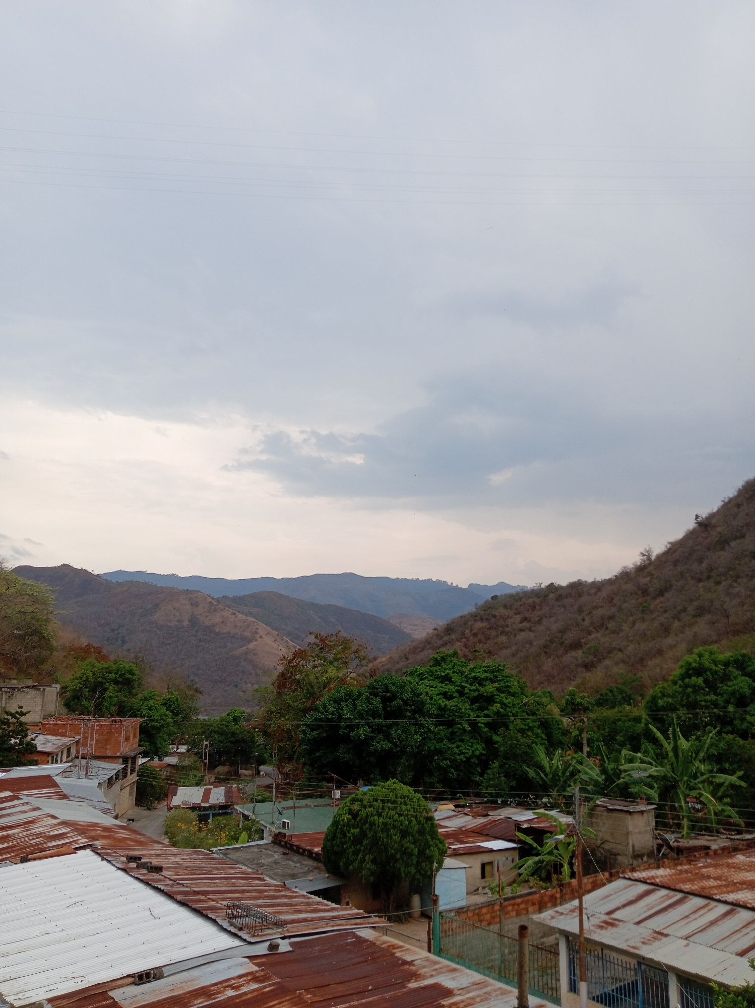 view of Las Tejerías, Venezuela, from an elevated position. In the foreground are rooftops of buildings, mostly corrugated metal. Some rooftops are white and others are rust-colored, showing signs of age and wear. Between the buildings are lush green trees and vegetation. In the midground, a valley with mountains rising in the background are covered in sparse, dry vegetation, with shades of brown and green. Above the valley and mountain range, a cloudy sky fills the upper portion of the image. Thin electrical wires run across the top of the frame. There is no visible evidence of people or active interaction in this photograph.