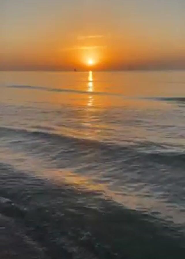 serene sunset over the ocean. The sun is low on the horizon, casting a golden glow on the water. Gentle waves roll toward the shore, their surfaces reflecting the sunlight. There are a few boats visible in the distance, silhouetted against the bright sky. The beach in the foreground consists of dark-colored pebbles. The scene appears peaceful and tranquil.