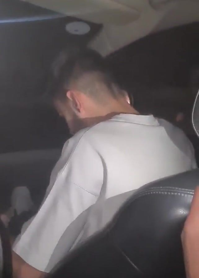 A man is visible in the back seat of a car, facing away from the camera. He wears a light-colored t-shirt, has short dark hair, and appears to be dancing or moving his arms rhythmically. Another person, presumably holding a smartphone, is to the side of the man and briefly shines the phone's flashlight on him. The car has a sunroof, and through the back window, taillights of another car can be seen. The interior of the car is dark. The overall impression is a candid, possibly celebratory moment in a moving vehicle.