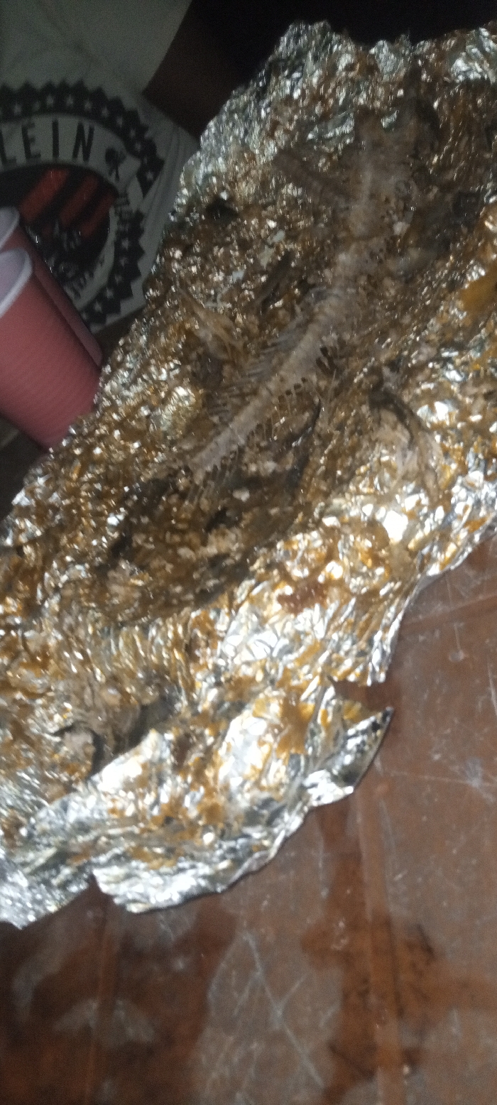 A spent fish skeleton sits on a foil-lined surface, remnants of the meal visible