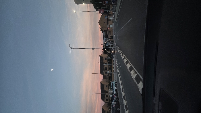The image depicts an urban street scene at twilight, captured from inside a vehicle in La Coma, Spain. The sky transitions from a deep blue at the zenith to a pale pink-orange at the horizon. A small, bright white object, identified as a crescent moon, is visible in the upper-left sky. In the foreground, the dark dashboard and base of the windshield of the observer's vehicle are visible. The central and lower-middle portions of the image are dominated by a paved asphalt road featuring a central median. This median is delineated by black and white striped curbs, separating traffic lanes. White solid lines mark the road. To the left of the road, a parking area contains several parked passenger vehicles, including a dark-colored SUV and multiple lighter-colored cars. Beyond the parking area, low-rise buildings with light-colored facades and dark roofs line the street. To the right of the road, additional buildings are present, including a taller, multi-story structure with illuminated windows on the far right. A commercial sign is partially visible on this side. Multiple streetlights are active, with their bright luminaires casting light onto the scene. A prominent tall streetlight with a horizontal fixture stands near the center of the frame. In the distance, a vehicle with activated headlights is observed approaching from the right lane. The overall scene suggests an evening or early morning hour in a developed urban or suburban area. No individuals are clearly visible.