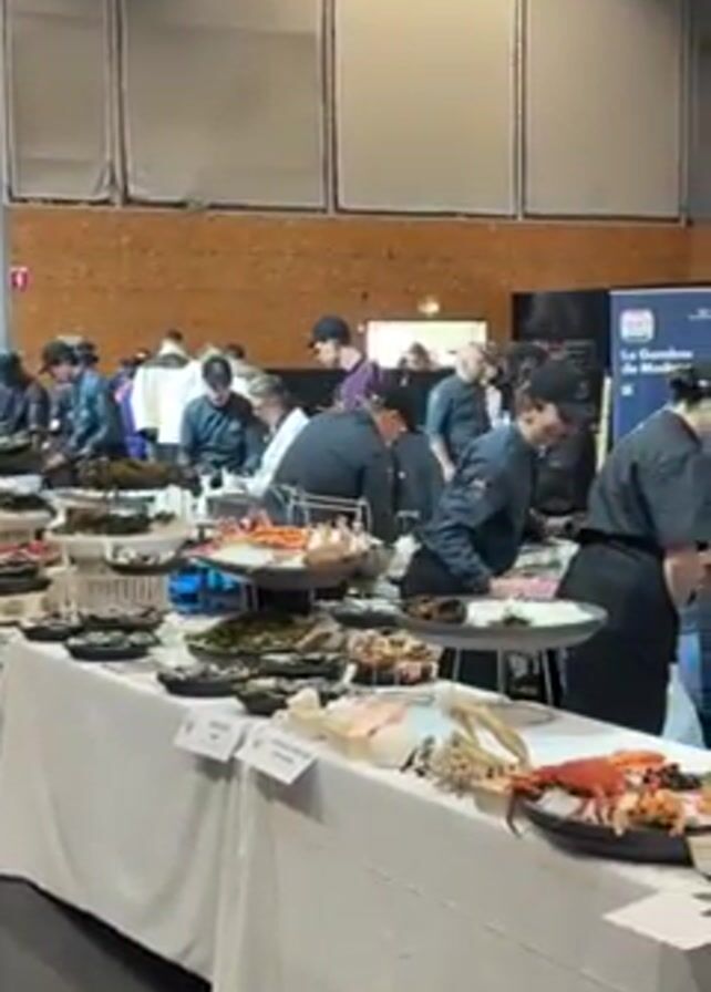 culinary competition or event taking place in a large indoor venue, possibly a convention center. Several tables are covered in white tablecloths, displaying seafood arrangements, including lobsters, oysters, and other shellfish. Chefs in black uniforms and hats work at the tables, arranging and preparing the seafood. Some individuals not in uniform also move around the tables. A large screen in the background shows a close-up image of a seafood platter similar to those being prepared. The venue has a high ceiling with visible structural beams and good lighting. People are moving around in the background, observing the chefs at work.