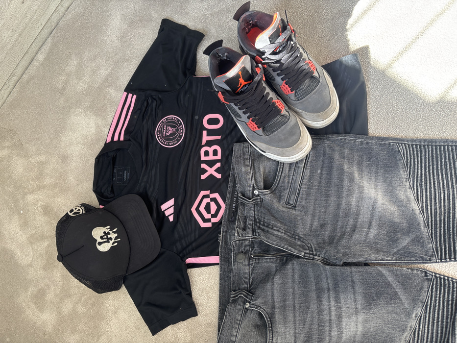 The image displays an assortment of apparel and footwear laid flat on a light-colored carpeted surface within Welwyn Hatfield, United Kingdom. From top-left to bottom-right, the items are arranged as follows: a black mesh trucker hat with a white, dripping heart design enclosing the letters "LA" and a white peace symbol on the side; a black short-sleeved football jersey featuring pink Adidas stripes on the shoulders, a pink Adidas logo, a pink Inter Miami CF crest, and a pink "XBTO" sponsor logo with a hexagonal graphic below it; a pair of dark grey denim jeans with a visible "ARMANI EXCHANGE" label on the waistband, ribbed knee panels, and a zippered fly; and a pair of grey sneakers with black laces, red interior accents, and white soles, identified as Jordan 4s, positioned to the right of the jeans. Sunlight illuminates the lower right portion of the scene.