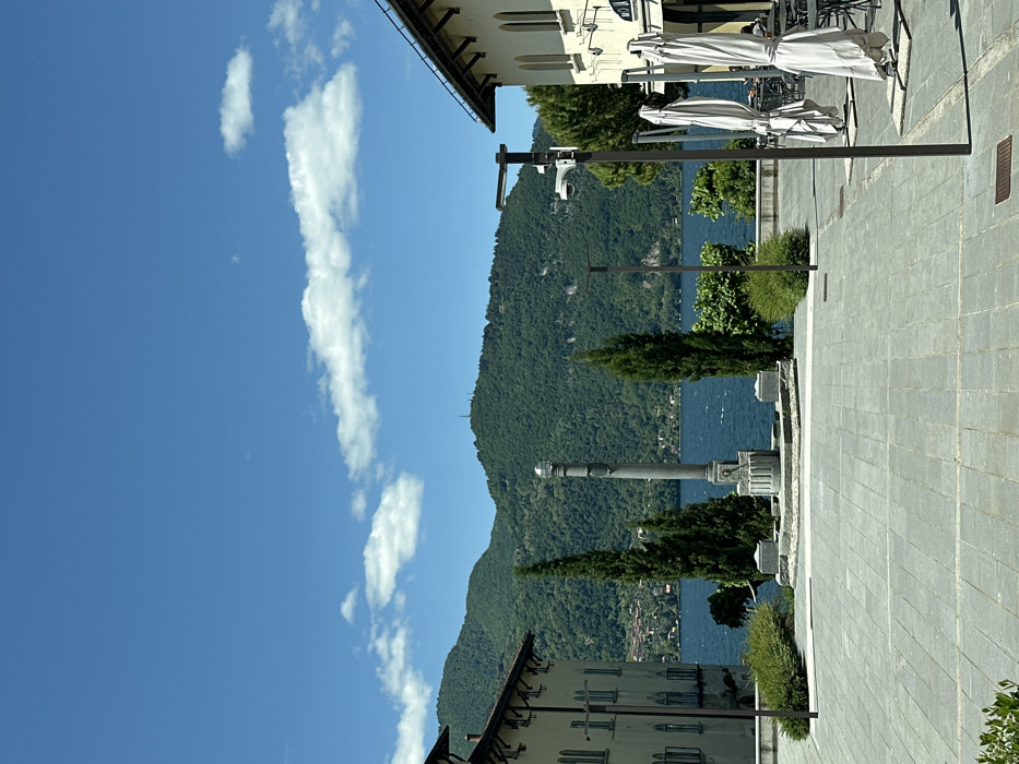 The scene is a public square in Lierna, Italy, located at latitude 45.96, longitude 9.302. The square is paved with grey tiles. In the center of the square stands a tall, slender, stone column, possibly a monument or a fountain. The column is topped with a metal sphere. On either side of the column, there are two tall, slender trees. Behind the column, a body of water, likely Lake Como, stretches towards a mountain range in the distance. The mountains are covered in lush green vegetation. The sky is bright blue, with scattered white clouds. To the left of the square, there is a building with a light beige facade and brown window frames. A second, taller, building with similar features can be seen in the upper right corner of the image, partially obscured by the edge of the frame. Two streetlights with black poles are visible in the right part of the square. One streetlight has a security camera on its arm. Two white umbrellas are open, positioned next to the right-hand side of the square, in front of the taller building. The square is empty, with no people present. The scene is bright and sunny, and there are no visible signs of activity or movement.