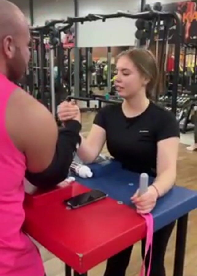 A man and a woman are arm wrestling at a red, blue, and white table in a gym. The man is on the left, wearing a sleeveless pink shirt and a black sleeve on his left arm. He is bald and has a beard. The woman is on the right, wearing a black t-shirt and black leggings. Her hair is brown and pulled back. Their hands are clasped in the center of the table. A black smartphone lies on the table near the man. A white bottle and a pink strap are on the woman's side of the table. Gym equipment is visible in the background. Other people are working out in the background. The lighting is bright. The camera is stable.