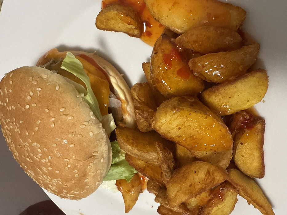 A close-up image displays a meal served on a white plate, consisting of a hamburger and potato wedges, located in Burjassot, Spain. The hamburger, positioned towards the top left, features a sesame seed bun, light green lettuce, a thick layer of orange melted cheese or sauce, visible white onion slices, and a creamy white sauce on the bottom bun. A reddish-orange sauce is also present near the bottom bun. Adjacent to and below the hamburger, a substantial portion of golden-brown potato wedges is arranged. Many of these wedges are coated in a glossy, reddish-orange sweet chili-type sauce. No individuals are visible in the scene. The background is out of focus and dark, suggesting an indoor environment.