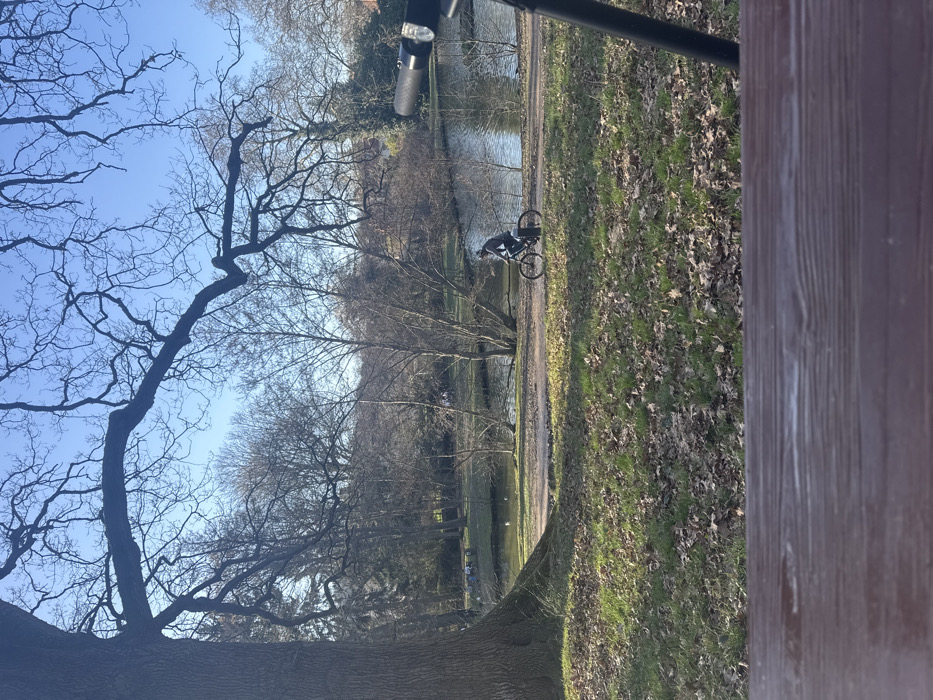 The scene depicts a park located in Saint-Rémy-lès-Chevreuse, France, observed during daylight hours. The lower foreground is occupied by a blurred, dark brown wooden surface, possibly a table or bench. To the right, a black tripod leg is partially visible, supporting a dark object with a cylindrical component and a white reflector. The midground features a grassy area sparsely covered with fallen brown leaves, bathed in sunlight. A dirt path traverses horizontally across this section. One individual, dressed in dark clothing and a helmet, rides a bicycle from left to right along this path. Behind the path lies a body of water, appearing as a pond or small lake, reflecting the clear blue sky. Several small, white fowl are visible on the water near the left bank. The background consists of a dense arrangement of deciduous trees with bare branches, interspersed with some evergreen foliage, under a clear blue sky. A light-colored building with a dark roof is partially visible through the trees on the far right. A large tree with extensive, bare branches, originating from a thick trunk in the foreground left, extends across the upper portion of the image.
