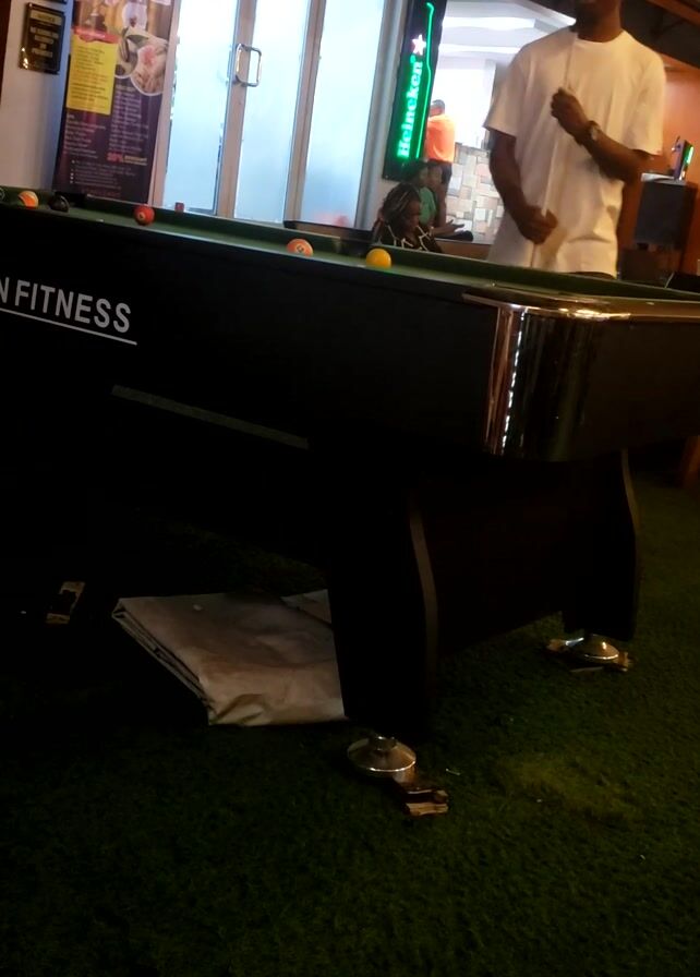 A man stands behind a pool table indoors, holding a pool cue. He wears a white shirt and a watch on his left wrist. The pool table is black with chrome trim, and has "N FITNESS" printed on its side. Pool balls are set up on the table. To the left of the pool table is a window or glass door. A "Heineken" sign is visible above the door, and a menu is posted on the wall next to it. The floor is covered with artificial turf. Another person, wearing a colorful head covering, is visible in the background.
