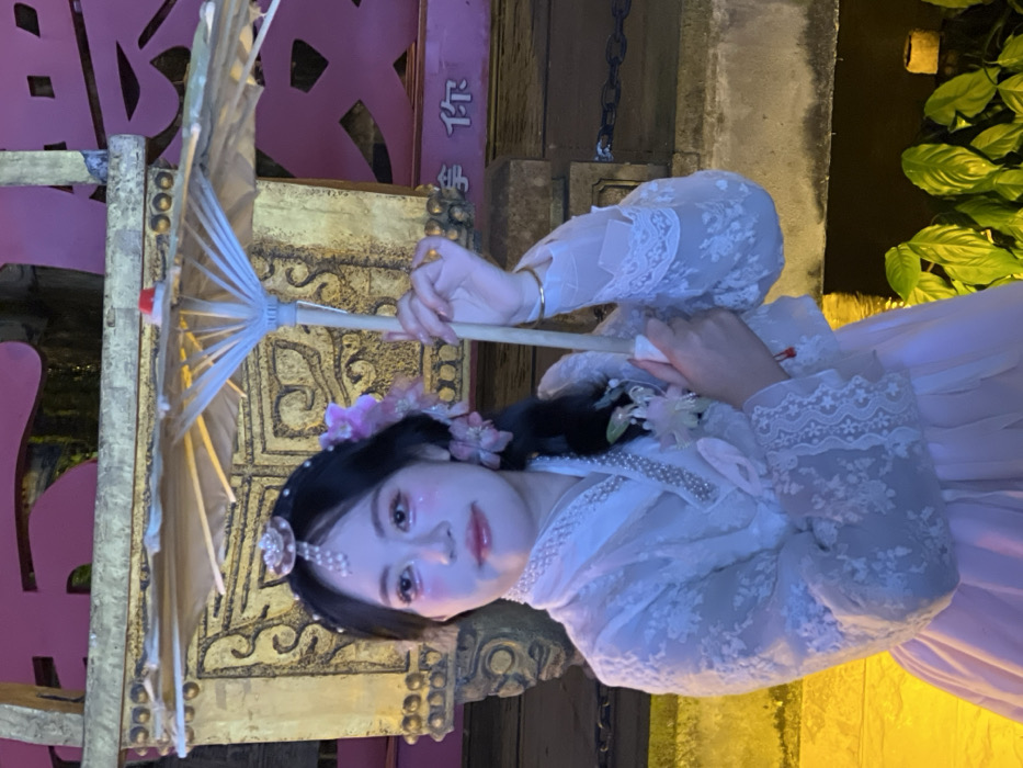 A female subject, appearing young adult, is depicted from the waist up in Yuzhong District, China, standing against a backdrop of ornate golden architectural elements and a pink-purple illuminated structure featuring Chinese characters. The subject has dark hair styled with a decorative pearl and floral headpiece, and artificial pink flowers are tucked into her hair on the right side. Her makeup includes prominent pink blush and eye shadow with glitter accents. She is wearing what appears to be traditional East Asian attire, consisting of a white lace outer jacket with wide sleeves over a lighter inner layer, and a pastel pink skirt. Her right hand is holding the wooden handle of a partially open, light-colored paper or fabric umbrella, positioned slightly above and to her right. A thin gold-colored bracelet is visible on her right wrist. The background includes green foliage in the lower right corner, illuminated by a warm light source. The golden architectural features behind her show intricate carvings.