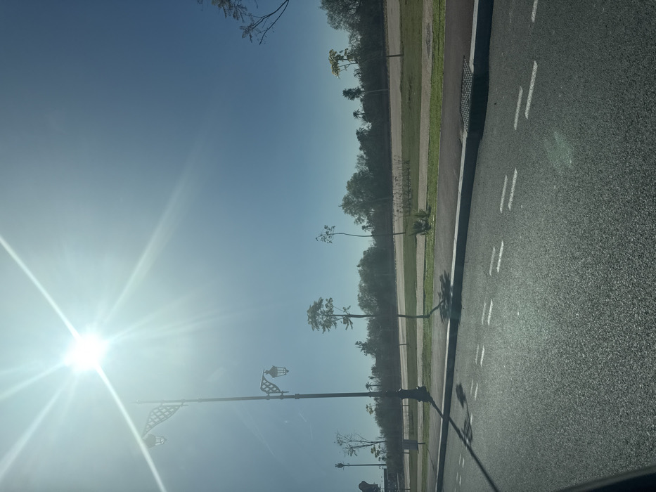 This image depicts an outdoor scene in Ouahat Sidi Brahim, Morocco, under a clear, bright blue sky with a prominent sunburst in the upper left quadrant. The scene is viewed from a low perspective, likely from inside a vehicle. In the foreground, a dark asphalt road occupies the lower portion of the frame, marked with three sets of parallel white dashed lines on the right side, indicating a lane or shoulder. To the right of the road, a concrete curb separates it from a paved pathway, which is followed by a strip of green grass. Beyond the grass, a lighter-colored dirt or gravel path is visible, with sparse vegetation. A tall, dark streetlamp, featuring two ornate, cage-like lanterns with decorative lattice work, stands prominently on the left side of the image, extending from near the bottom to the upper left. The streetlamp casts a long, dark shadow diagonally across the road and the adjacent green space to the right. Several young, sparsely leafed trees are planted intermittently along the grassy median, also casting distinct shadows. In the mid-ground and background, a dense line of diverse trees, including several tall palm trees, forms a green barrier or forested area. No individuals, animals, or moving vehicles are present in the visible portion of the scene. A single metal grate is observed in the curb in the lower right.