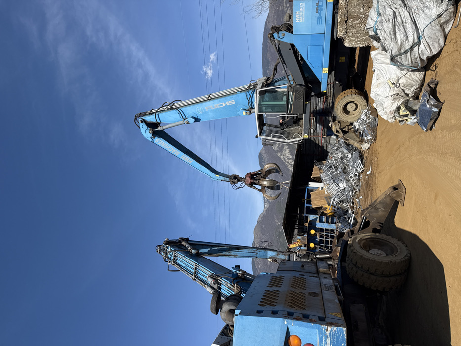 The scene depicts an industrial scrap metal yard located at the base of a mountain range, consistent with the geography of Sopot, Bulgaria. The sky is clear blue with sparse cirrus clouds. Two large, light blue industrial material handlers are positioned on a dirt ground surface. The machine on the right is a Fuchs MHL 340D, clearly labeled "FUCHS" and "HWH MACHINES." Its multi-tined grapple attachment is open and elevated above a large pile of shiny, processed scrap metal, which appears to be aluminum or similar light-colored alloy. The machine's operator cabin is visible, but no individual is discernible within it. Stabilizer outriggers are deployed near its wheels. The machine on the left is partially visible, also light blue with "HWH MACHINES" visible on its boom structure. It has large tires and a rear section with orange marker lights. Its boom is positioned to the left. Between the machines and extending towards the foreground is a substantial pile of various scrap metal pieces. In the foreground to the right, several large, light-colored industrial bags, one appearing to contain a block of compressed material, rest on the dirt. In the mid-ground, behind the scrap pile and machines, a low-rise industrial building with a dark roof and corrugated metal siding is visible. Utility lines traverse horizontally across the background. A range of mountains, primarily bare or sparsely vegetated, forms the distant horizon under the blue sky. No individuals are clearly visible in the scene.