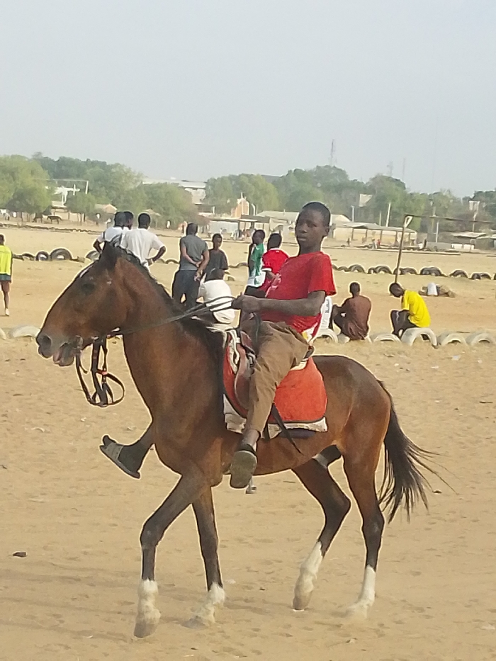 - "A young boy in a red shirt and brown pants rides a brown horse with white socks in a sandy area" by FM-WfIwR2, licensed under CC BY 4.0