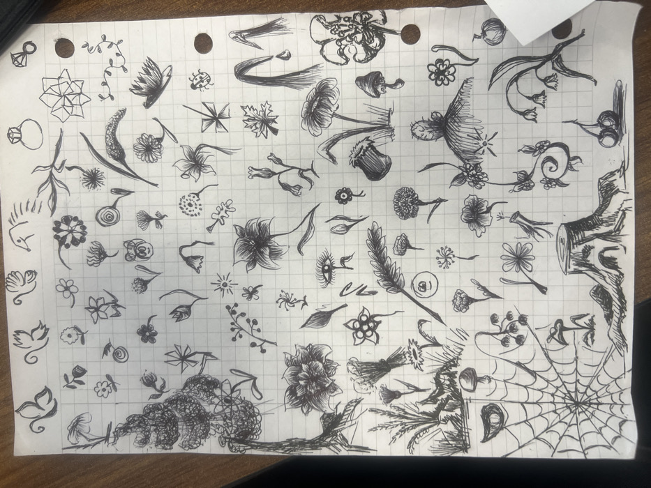 - "A white sheet of squared paper, measuring approximately 21x29 cm, displays a dense collection of over one hundred distinct hand-drawn doodles rendered in black ink" by FM-n8m8f2, licensed under CC BY 4.0