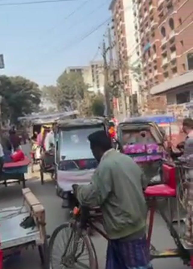 busy street in what appears to be a South Asian city. Several rickshaws and auto-rickshaws, along with bicycles, are navigating the crowded road. People are moving about, some pulling rickshaws and others walking. Buildings of varying heights line the street, and utility poles with wires are visible against a clear, bright sky. The video seems to be taken from the perspective of someone on another rickshaw or bike, as the handlebars are visible in the foreground.
