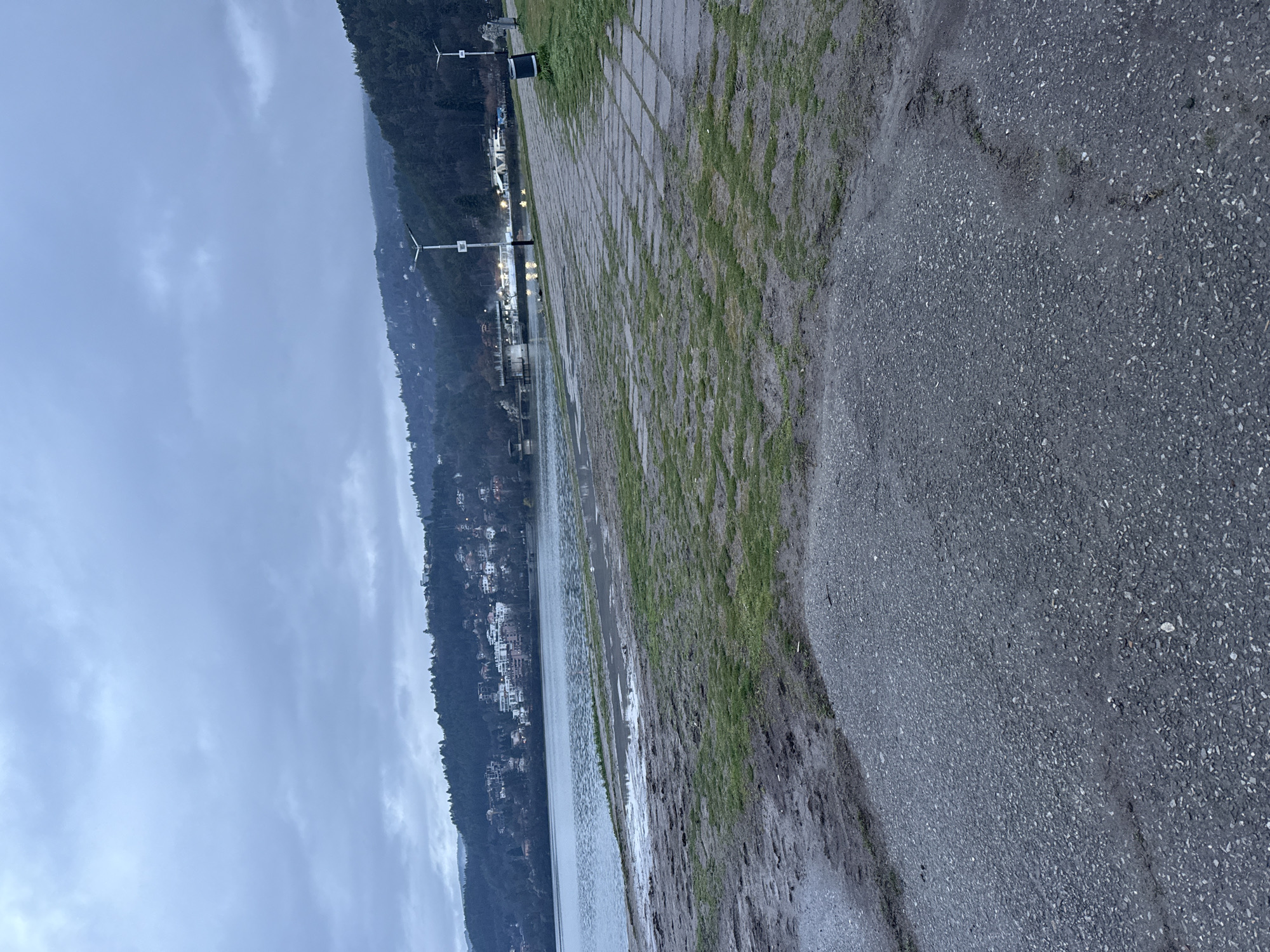 The image depicts a waterfront scene on a cloudy day. A body of water, possibly a lake or bay, stretches along the left side of the frame, bordered by a forested hillside dotted with buildings. A paved path runs along the right side, adjacent to a muddy area interspersed with patches of grass. The path appears to lead toward a pier or dock visible in the distance, marked by evenly-spaced lights. Two wind turbines are on the shore. It is not possible to determine the location as German, Bulgaria based on visual information.