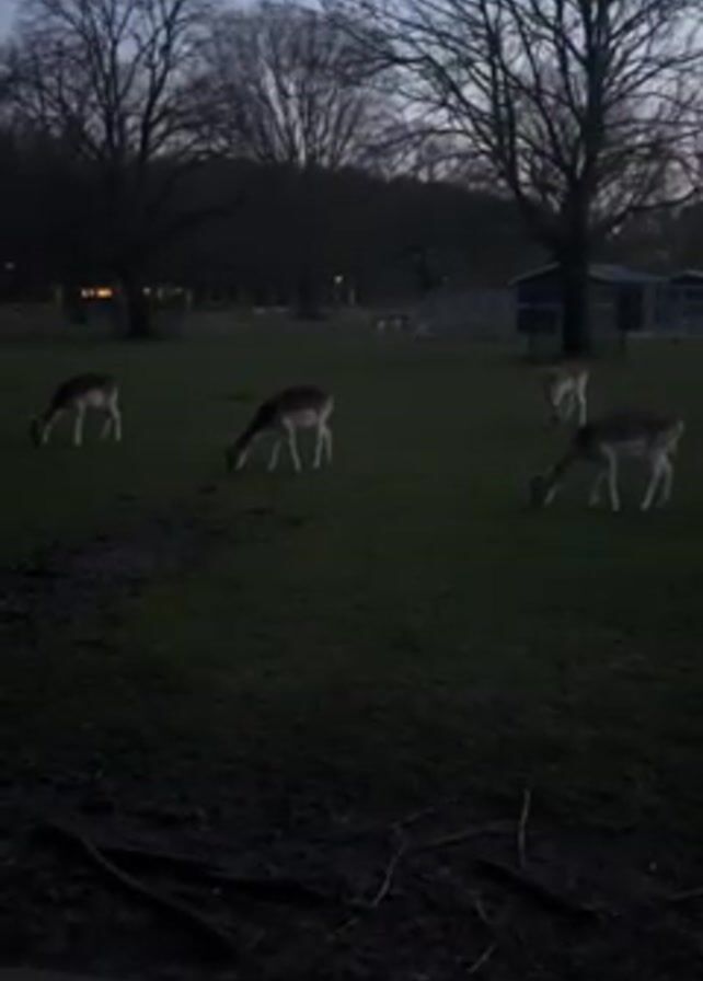 group of deer grazing in a park at dusk