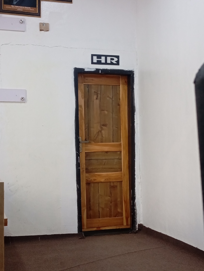 A wood door is framed by a dark border, above it, the letters "HR" are stenciled onto the white wall. The door has two horizontal panels and a simple latch. The wall has a crack that extends from the top left corner. There is a framed picture and two name plates on the wall to the left. The floor is carpeted in brown.