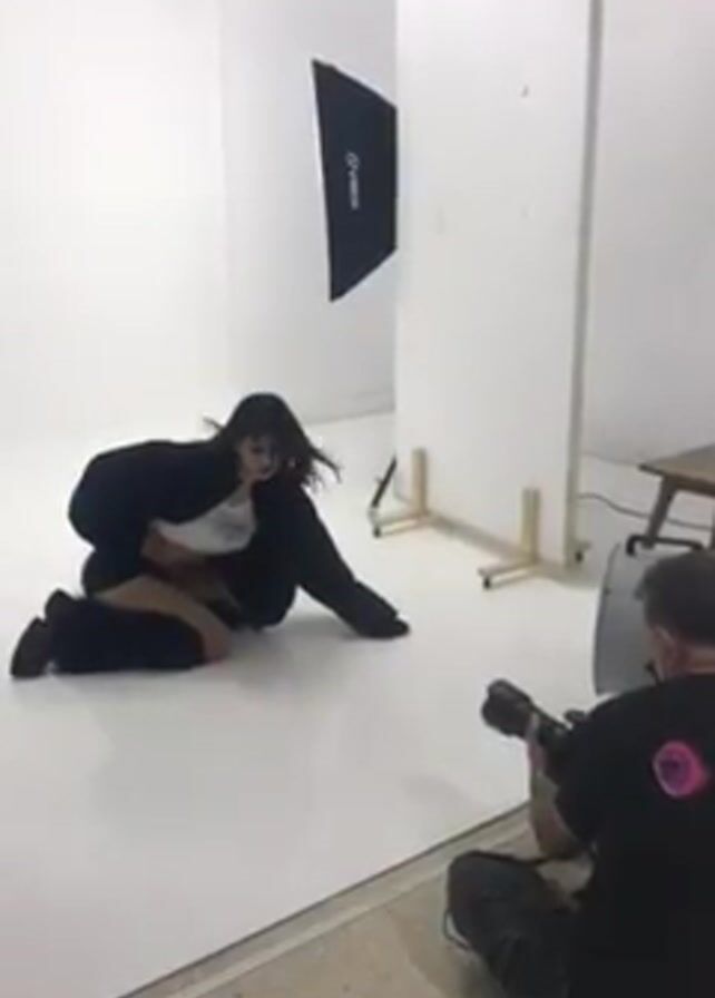 In a brightly lit, white studio, a woman poses on a white floor in front of a white backdrop supported by wooden legs. She is wearing a white top, a black blazer, and black boots. Her hair is dark and blows slightly. A photographer sits on the floor facing her, holding a black camera. A black softbox is positioned near a corner of the room. There's also a small wooden stool. The photographer is wearing a black t-shirt with a pink logo that says "PUNTO DE FUGA."