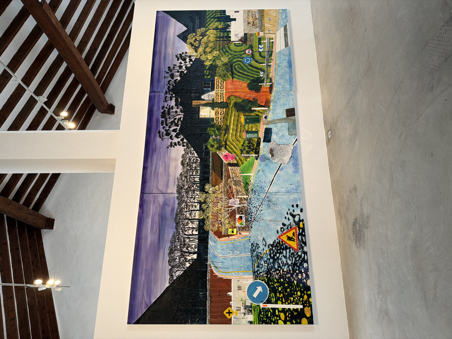 The image displays the interior of an art gallery in the city of Eivissa, Spain, showcasing a large, multi-panel contemporary artwork mounted on a white wall. The artwork, consisting of at least three vertical panels, depicts a vibrant, stylized landscape or townscape under a purple and blue sky. Dark, textured mountains frame the scene, with a line of silhouetted trees spanning the mid-ground. A prominent blue-grey road, appearing wet or reflective, curves through the center, leading past various colorful, geometrically distinct buildings with red roofs and green elements, including terraced hillsides. Several road signs are integrated into the painting: a blue circular 'turn right' sign and a yellow 'intersection ahead' sign in the left foreground; a yellow 'road work' triangular sign on the road surface; and a blue 'roundabout' sign and a white '60 km/h speed limit' sign on the right. The gallery space features smooth, light grey concrete flooring and a high, vaulted ceiling with exposed dark wooden beams. White track lighting fixtures are visible on the ceiling, illuminating the artwork. A thick white structural pillar extends vertically from the floor to the ceiling on the right side of the frame. No individuals are present in the scene.