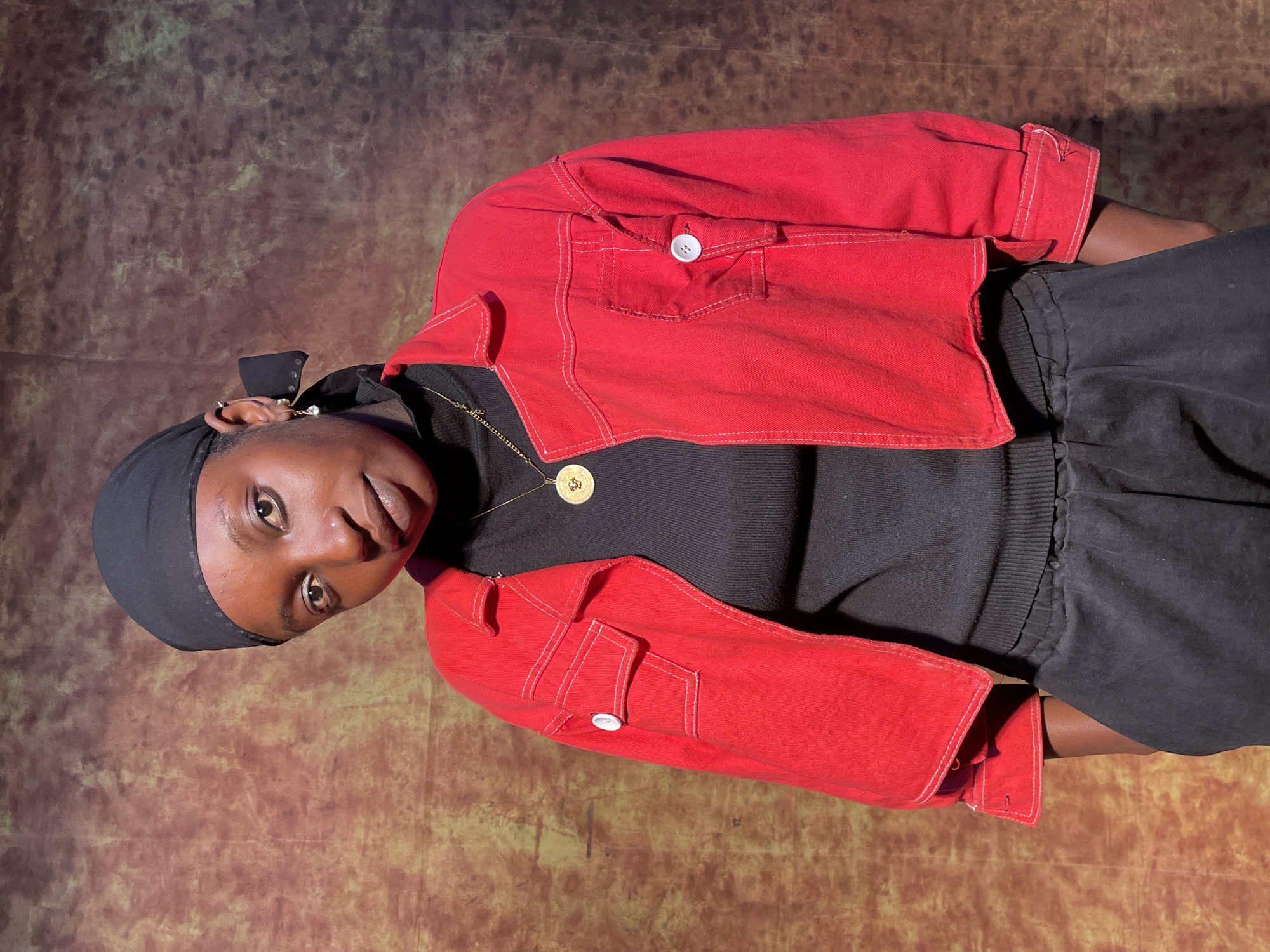 A young woman with brown skin, wearing a black head covering and gold necklace, looks at the camera while posing in front of a mottled brown background. She is wearing a black turtleneck sweater and a short red denim jacket with white stitching and white buttons. The location is not specified, and there is no evidence to indicate that it is Barakin Akawo, Nigeria. The subject’s clothing, jewelry, and expression are the primary focus of the photograph.