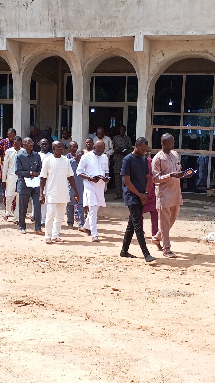 In Egbedi, Nigeria, a group of approximately 15-20 adult males walks in a procession outdoors, moving from left to right across the frame. The men are predominantly dressed in traditional Nigerian attire, including long tunics and trousers, in shades of white, brown, grey, and patterned fabrics. One individual in the foreground wears a dark t-shirt and black trousers. Several men, particularly in the front and middle of the line, are holding open books or pamphlets. Some individuals are barefoot, while others wear dark footwear. The background features a light-colored, multi-arched building, likely constructed of concrete or stucco. Five distinct arches are visible, each filled with large glass window panels and doors, reflecting elements of the outdoor environment. The upper section of the building appears unfinished, with exposed concrete and structural elements. The ground beneath the men consists of dry, light brown earth or sand, scattered with minor debris and sparse vegetation. The scene is illuminated by natural daylight, casting subtle shadows.