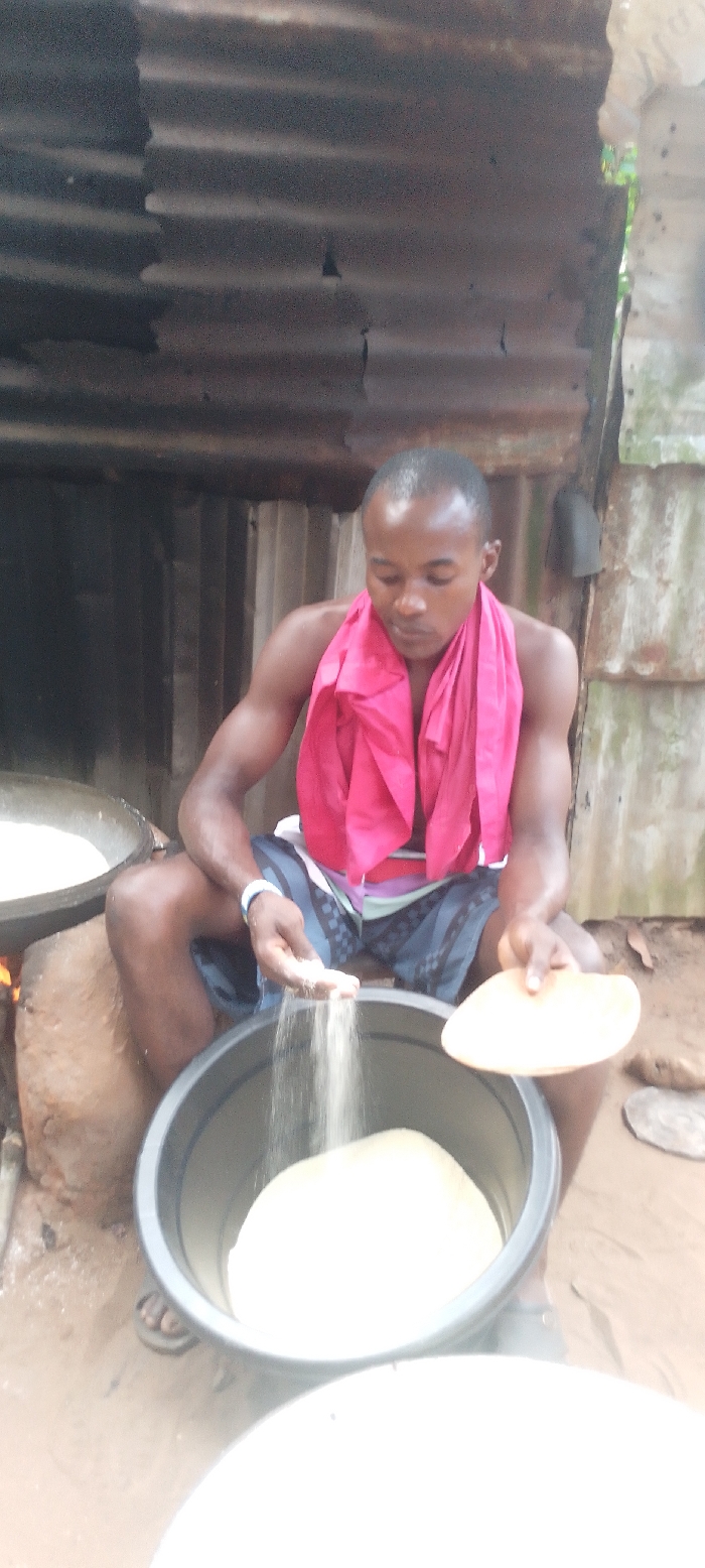 In Ohafia, Nigeria, an adult male with dark skin and short dark hair is depicted seated in an outdoor or semi-sheltered area. He wears a bright pink fabric draped over his shoulders and upper torso, dark patterned shorts, and a white wristband on his left wrist; his feet are bare, with sandals visible nearby. The man's left hand holds a quantity of light-colored, granular material, which is actively pouring into a large, dark grey plastic bucket positioned directly in front of him. The bucket contains a substantial mound of the same granular substance. His right hand holds a small, light-colored, oval-shaped plate or tray. To the immediate left of the man, a large, dark metal pot or cauldron rests on a makeshift stove assembly, showing an orange glow indicative of a fire beneath it. This pot contains a light-colored, semi-liquid substance. The background consists of weathered, corrugated metal sheets forming a wall, with an adjoining section of a different, more irregular wall material visible to the right. The ground beneath the scene is uneven, reddish-brown earth.