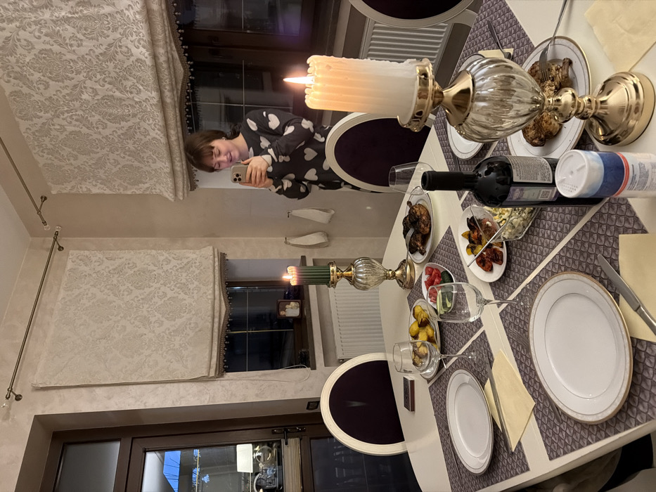 An indoor scene in Mishutkino, Russia, depicts a dining area at night. A young female, approximately 15-25 years old, with short brown hair, stands on the right side of a white dining table, holding a light-colored smartphone with both hands at chest level, aiming it towards the table. She is wearing a dark long-sleeved top with white heart patterns and has a slight smile. The large rectangular white dining table is set for multiple individuals, though only two place settings are clearly visible in the foreground. Each setting includes a light grey patterned placemat, a white plate with gold trim, a wine glass, and cutlery (fork on left, knife on right, where visible). Yellow napkins are folded on the placemats. Several dishes are arranged on the table: two plates hold what appear to be roasted chicken pieces, one plate contains roasted potatoes, another has mixed grilled vegetables, and a clear glass bowl contains a salad. A dark wine bottle (likely red wine) is positioned towards the center-right. A white shaker bottle, possibly containing salt, is in the foreground. Two lit candles in decorative glass and gold-toned candlesticks illuminate the table. One large, ridged white candle is in the foreground right, and a smaller, ribbed green candle is further down the table to the left. The background features beige walls. Two large windows are visible, covered by light-colored Roman blinds with a damask pattern and beaded fringe. The windows show darkness outside, with a radiator visible beneath the right window. A dark wooden door with glass panels is on the far left, reflecting an interior light source and a table lamp. Two chairs with dark purple upholstered backs and white frames are partially visible at the table.