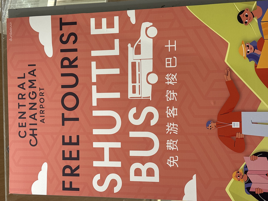 - "The image displays a vertical rectangular sign advertising a "FREE TOURIST SHUTTLE BUS" service for "CENTRAL CHIANGMAI AIRPORT," which is located in Suthep, Thailand" by FM-E1hwL2, licensed under CC BY 4.0