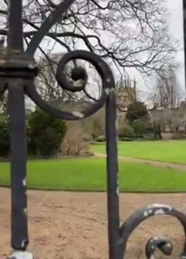 The camera looks through an ornate wrought iron gate, with scrollwork designs, at a building in the distance surrounded by a green lawn and trees. The gate is painted black and shows signs of age. The building in the distance has a distinctive spire. The sky is overcast. A gravel path is visible inside the gate. The trees are bare, suggesting it is winter or early spring. There are shrubs and other greenery inside the gate. The camera moves slightly.