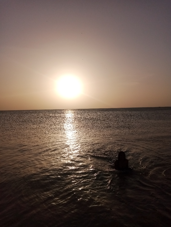 The image captures a coastal scene in Juan Griego, Venezuela, during a sunset or sunrise. A prominent, intensely bright sun is situated low on the horizon in the upper-left quadrant of the frame, casting a strong, vertical reflection path across the water. The sky above is a gradient of light purple and orange hues, with a few faint dark specks. The water surface, spanning the lower two-thirds of the image, is calm with visible ripples. One individual is positioned in the lower-right portion of the frame, partially submerged in the water. This person is presented in silhouette, with their head and upper torso visible above the waterline, facing towards the horizon. No other specific objects or landforms are distinctly visible on the distant horizon.