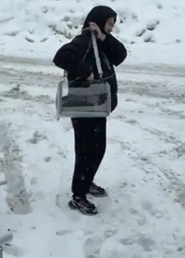 A person in black clothing stands in the snow while holding a gray cat carrier. The carrier has clear plastic sides and a gray mesh panel on top. The person is wearing a black jacket with a hood pulled up and black pants and shoes. Snow is falling. The person picks up the carrier by its handle. The person speaks and says something about cat fur. The background is a snowy street with buildings and cars covered in snow.