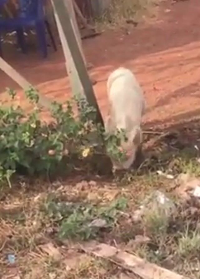 light-colored pig foraging in an area with dry grass, weeds, and scattered trash. There is a blue plastic chair and a leaning wooden structure visible in the background, along with a red dirt road. In the foreground are several blue and white buckets. The pig is near a bush with small pink and yellow flowers, which appear to be momentarily caught on its head.