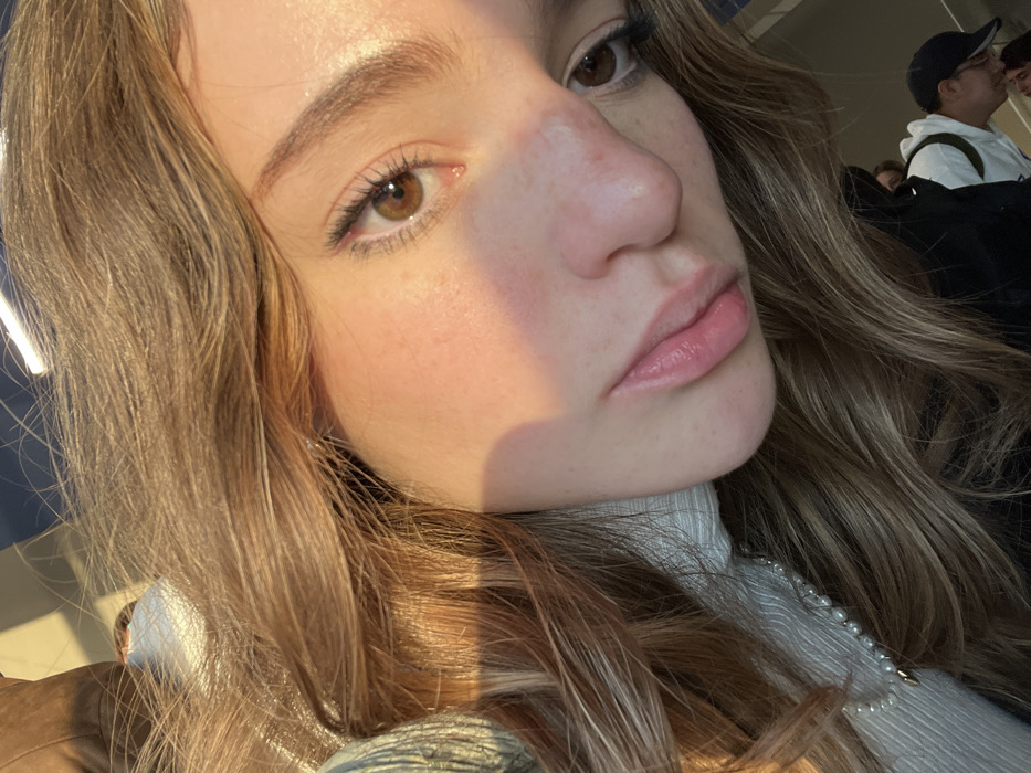 A close-up captures a young woman with light brown hair and brown eyes. Sunlight illuminates half her face, emphasizing her features: a slightly red nose, full lips, and subtle freckles. She wears light makeup and a white turtleneck with a pearl necklace detail. In the background, blurred figures of people and a blue wall are visible. The photo has a warm, natural aesthetic, likely taken indoors with sunlight streaming in.