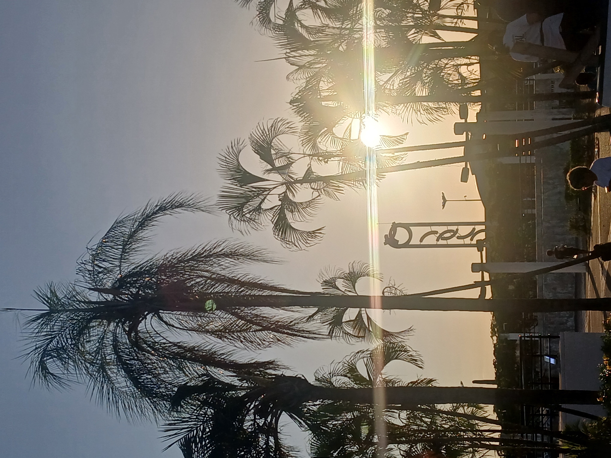 series of palm trees silhouetted against the setting sun. The location is likely within the city of Ciudad Guayana, Venezuela. The sun is partially obscured by the trees, creating a lens flare. People can be seen in the background on what appears to be a promenade. The signage reads "ORINO." There's evidence of street lighting and other urban infrastructure. The scene suggests a tropical setting.