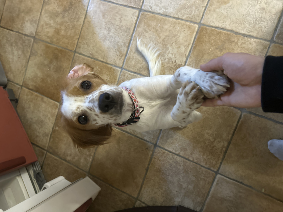 - "An indoor scene in Sofia, Bulgaria, depicts a white and light brown spotted dog standing on its hind legs, looking directly at the camera" by FM-MRhzP2, licensed under CC BY 4.0