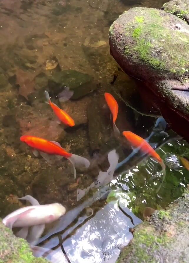 small, shallow pond with clear water. Several orange and white fish swim around rocks and mossy stones. The pond's edge is made of similar stones covered in moss. Sunlight reflects off the water's surface, creating a dappled effect on the pond floor. The fish move gracefully through the water, their fins trailing behind them.