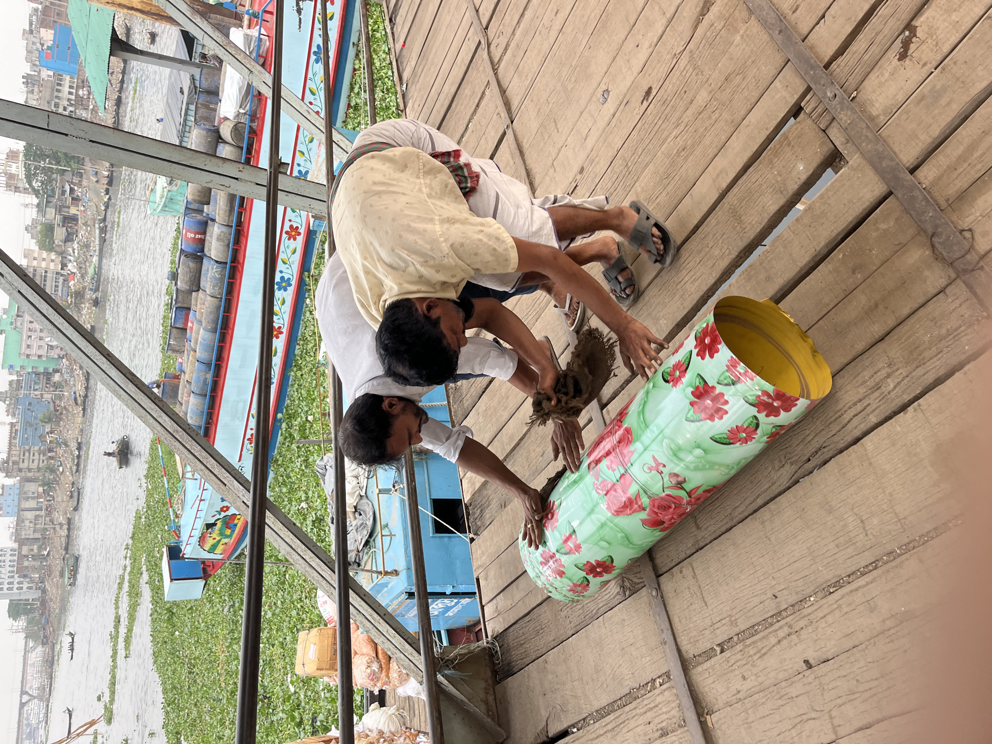 Two men are maneuvering a large, floral-patterned metal container on a wooden dock in Dhaka, Bangladesh