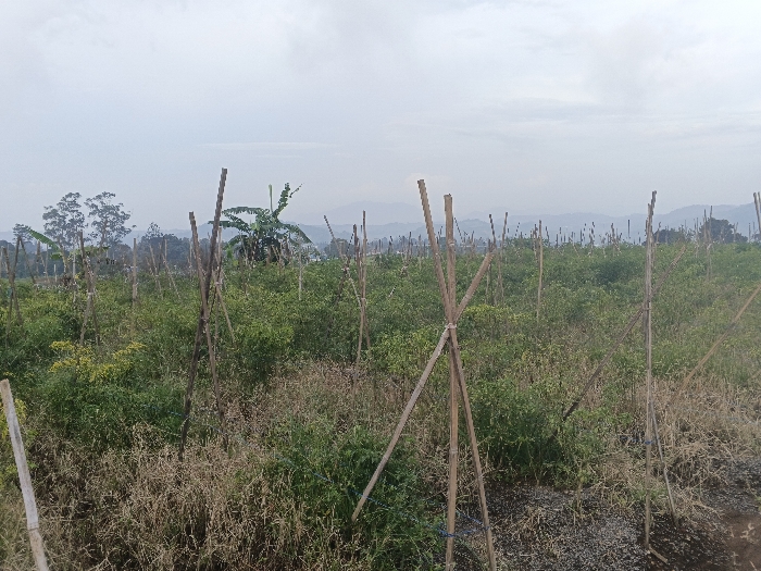 The image displays an agricultural field located in Siem Reap, Cambodia. The foreground and midground are characterized by dense green leafy vegetation, interspersed with numerous vertically positioned wooden stakes, primarily bamboo, often arranged in support structures such as tripods or pairs. Patches of desiccated brown plant matter are visible among the live greenery. The underlying ground surface is dark, exposed soil in various sections. In the immediate background, scattered trees are visible, including a prominent banana plant on the left side. The distant background features a hazy, undulating mountain range. The sky is uniformly overcast and light gray. No persons or animals are present within the frame. The scene is illuminated by diffuse daylight.