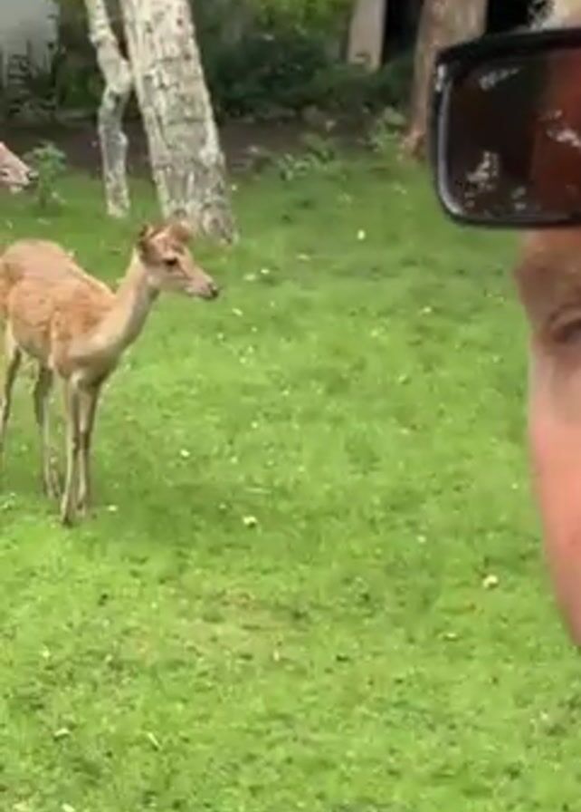 The video starts with a close-up of a man's face, who is looking off to the side. The camera then pans to show three deer standing in a grassy area. Two of the deer are closer to the camera and facing forward. In the background is a building and some trees. The deer appear alert and are looking around.